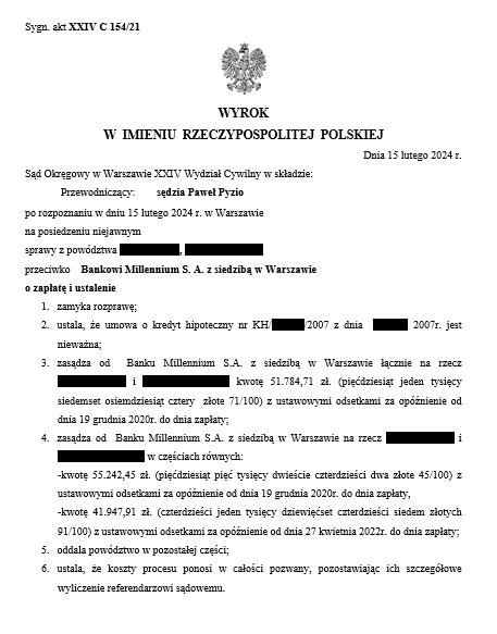 Z ogromną przyjemnością dzielimy się informacją, że kolejna umowa kredytu indeksowanego do waluty obcej – tym razem zawarta przez Kredytobiorców z Bankiem Millennium S.A. – została uznana za nieważną w całości.