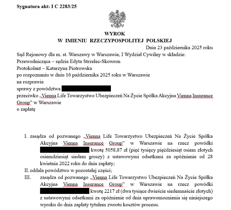 Wyrokiem wydanym w dniu 23 października 2025 r. Sąd Rejonowy dla m.st. Warszawy w Warszawie zasądził na rzecz konsumenta kwotę stanowiącą różnicę pomiędzy wpłaconymi przez niego środkami a dotychczas wypłaconym przez ubezpieczyciela świadczeniem.
